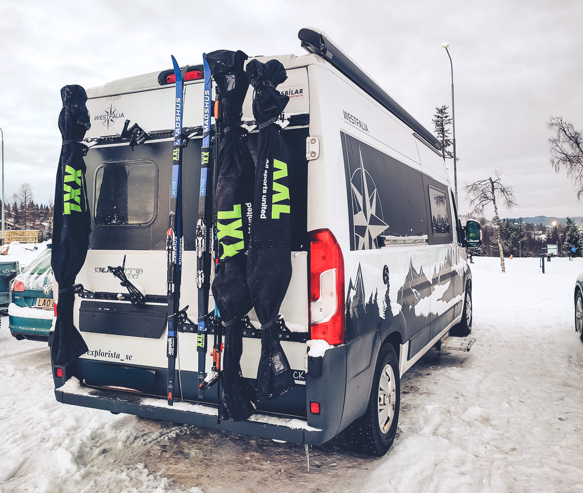 Whether cross-country skis, touring skis, alpine skis, or countless pairs of poles: they all find their place at the rear of the camper with the PUSHrack.